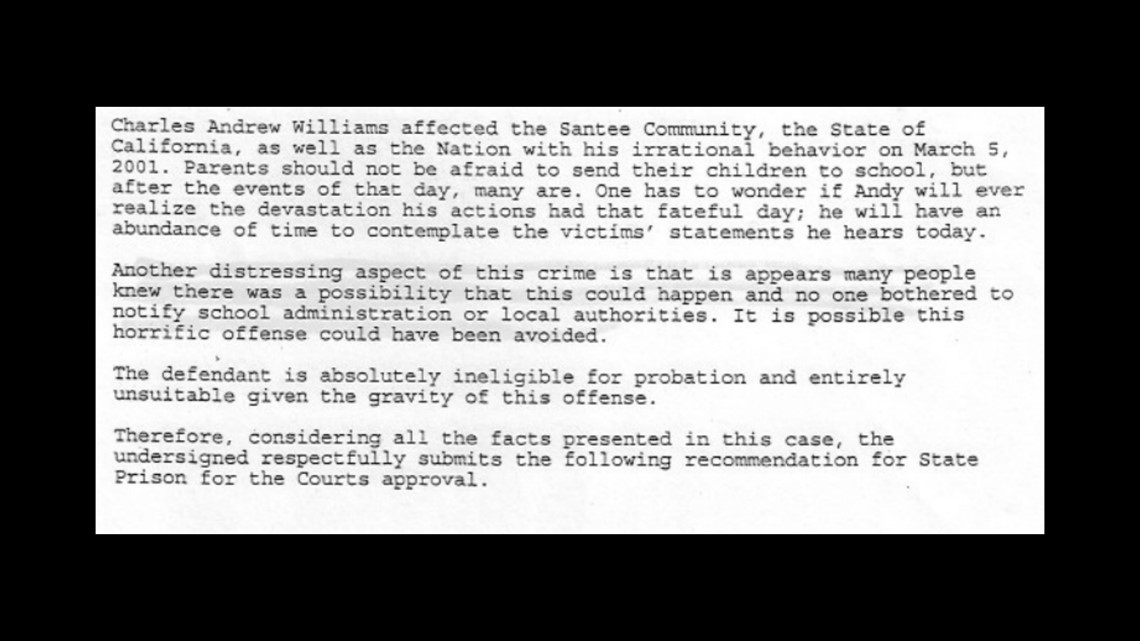 "Another distressing aspect of this crime is that it appears many people knew there was a possibility that this could happen, and no one bothered to notify school administration of local authorities," reads the investigation from the Parole Officer who worked on the 2001 criminal case, before concluding, "it is possible this horrific offense could have been avoided."