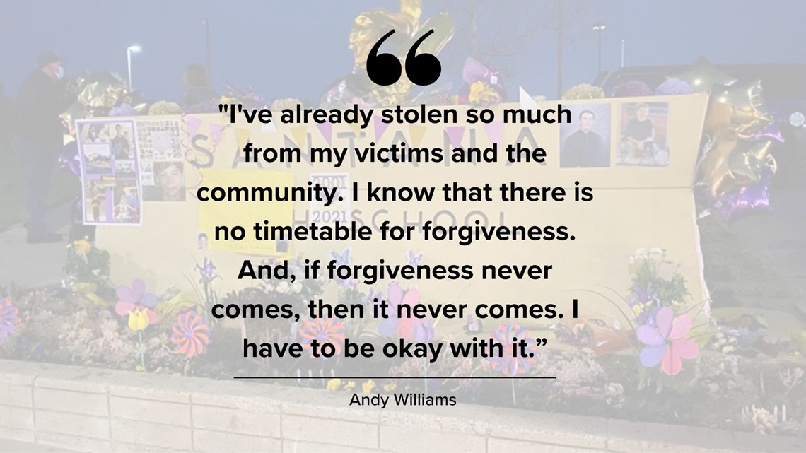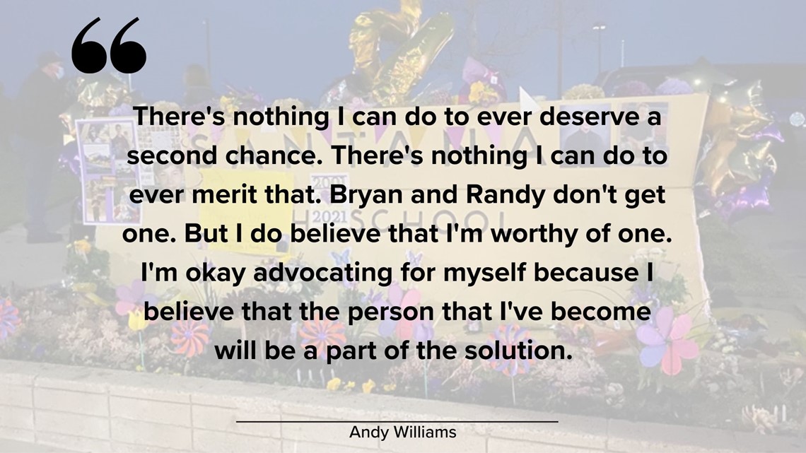 "There's nothing I can do to ever deserve a second chance. There's nothing I can do to ever merit that. Bryan [Zuckor] and Randy [Gordon] don't get one. But I do believe that I'm worthy of one. I'm okay advocating for myself because I believe that the person that I've become will be a part of the solution. If afforded the chance, I would do my part to promote healing, and try my best to work to prevent gun violence in schools,” Williams said.