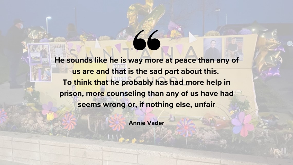 "He sounds like he is way more at peace than any of us are and that is the sad part about this. To think that he probably has had more help in prison, more counseling than any of us have had seems wrong or, if nothing else, unfair," Vader said.