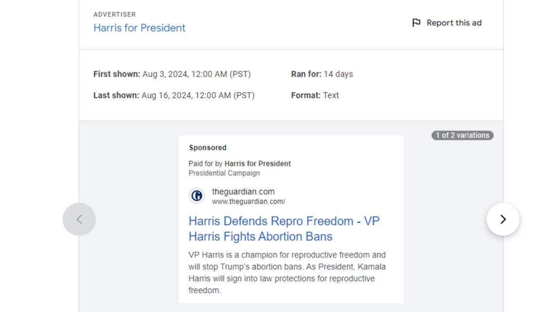 VERIFY found multiple examples of these ads paid for by Harris for President, which have appeared in some people’s Google search feeds in recent weeks, in the search engine’s Ads Transparency Center. The ads with altered headlines and descriptions link out to content published by The Associated Press, NPR, The Guardian, Reuters and The Independent.